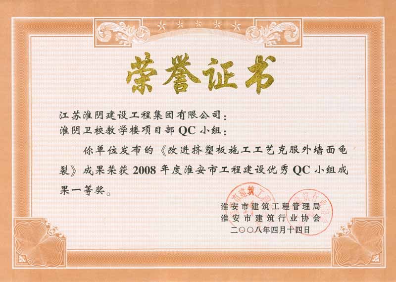 2008年市级QC一等奖(淮阴卫校教学楼-改进挤塑板施工工艺克服外墙面龟裂)