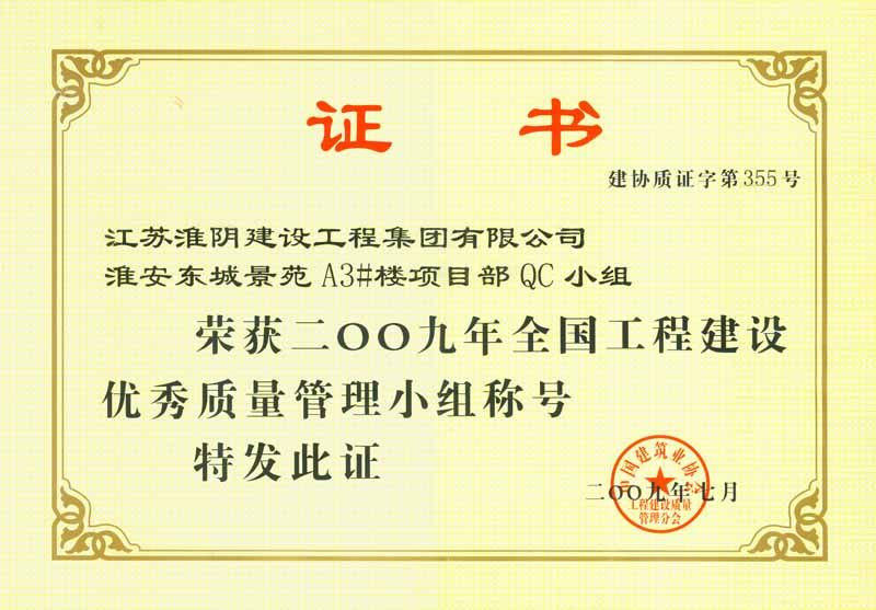 2009年全国工程建设优秀质量管理小组-东城景苑A3楼